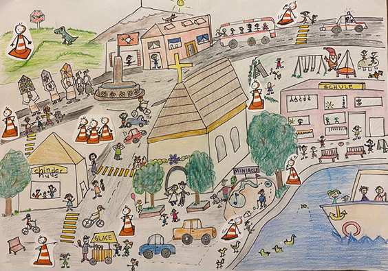 Im Chinderhuus gestalteten die Kinder zusammen mit unserer Betreuerin Paz ein grosses Wimmelbild. Darauf hielten sie unterschiedliche Situationen ihres Schulwegs kreativ fest und nutzten das Bild anschliessend, um diese gemeinsam zu besprechen.
